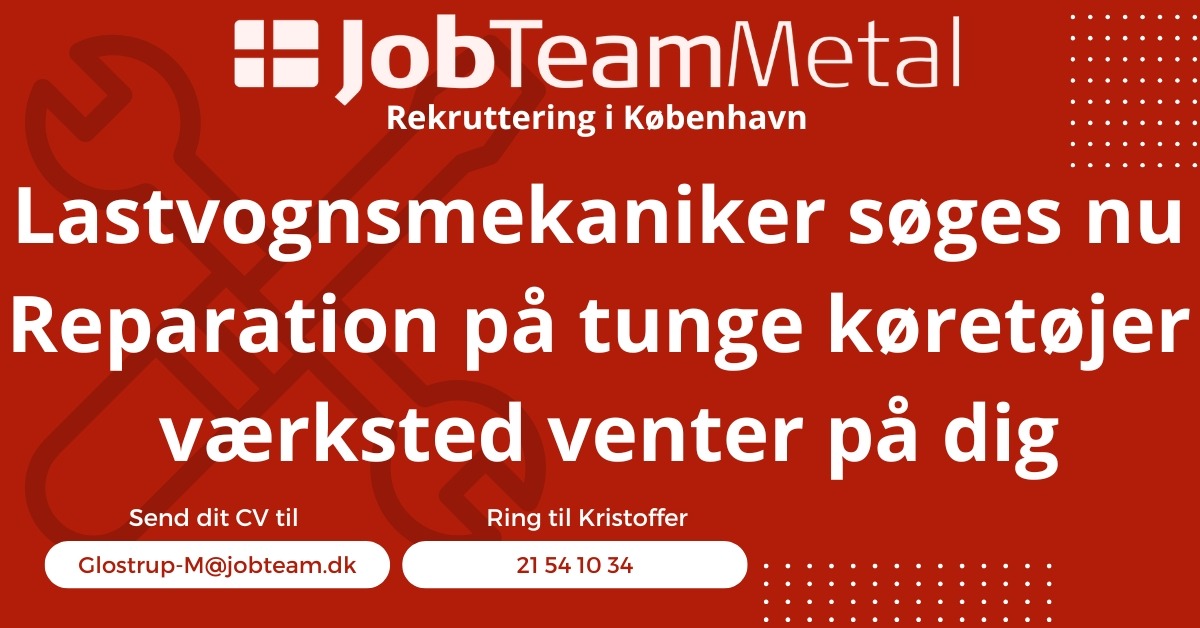 Send dit CV og en kort ansøgning til Glostrup-M@jobteam.dk (angiv “K1” i emnefeltet), eller ring på 21541034 — vi ser frem til at høre fra dig.