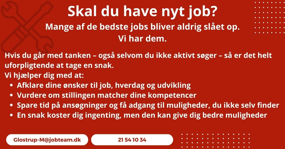 Send dit CV og en kort ansøgning til Glostrup-M@jobteam.dk (angiv “A10” i emnefeltet), eller ring på 21541034 — vi ser frem til at høre fra dig.