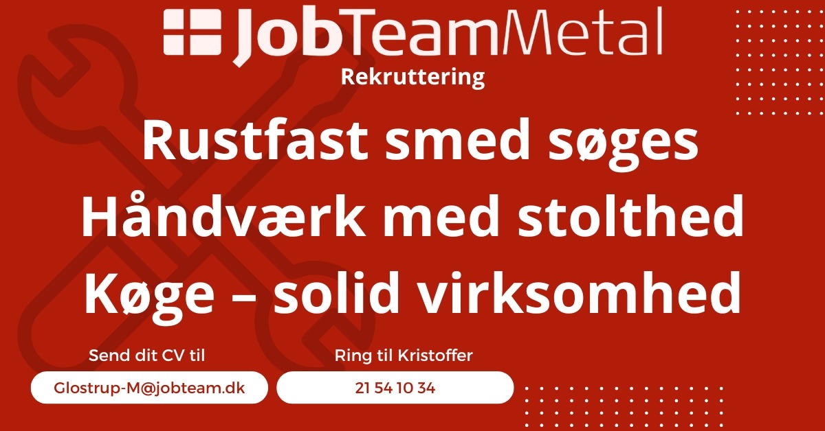 Send dit CV og en kort ansøgning til Glostrup-M@jobteam.dk med mærket “C2” i emnefeltet – eller ring på 21541034. Vi venter spændt på at finde den rette til holdet.