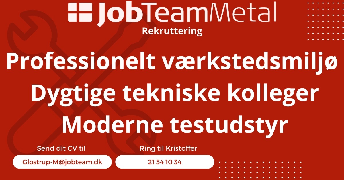 Send dit CV eller en kort ansøgning til Glostrup-M@jobteam.dk (angiv “H25” i emnefeltet) eller ring på 21541034. Vi afholder samtaler løbende og venter på den rette kandidat.