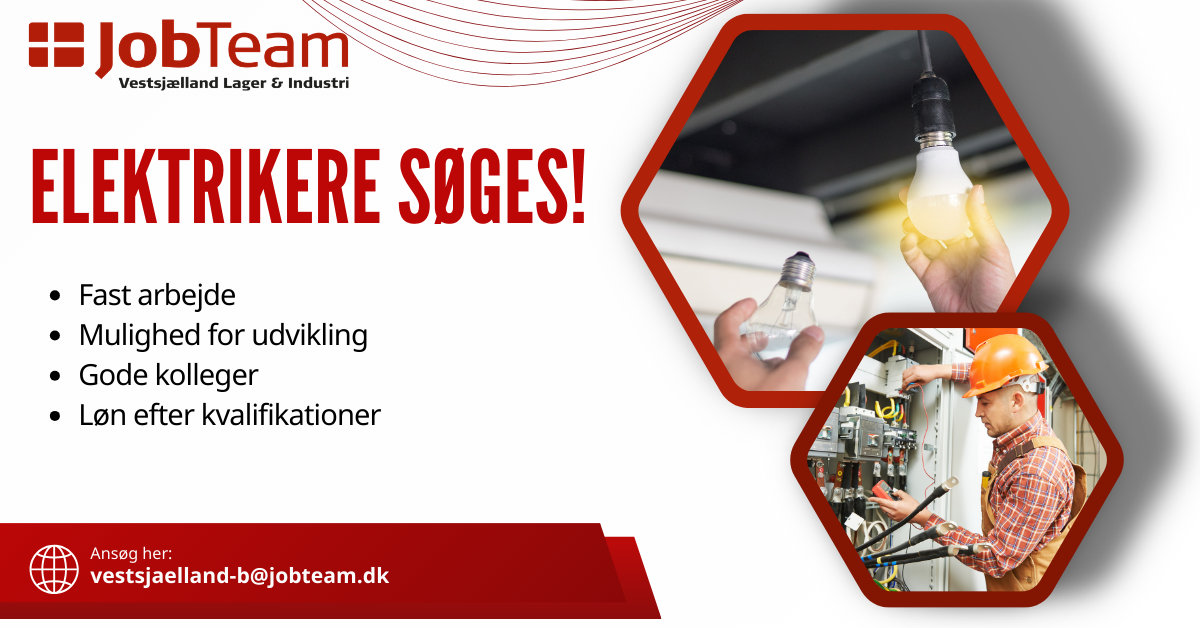 Så send dit CV til os på mail vestsjaelland-b@jobteam.dk med teksten : ELEKTRIKER SLAGELSE