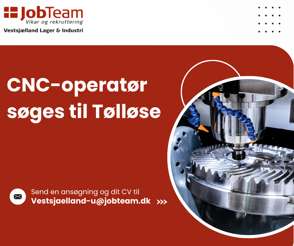 Hvis jobbet er noget for dig, så send dit CV og en ansøgning til Vestsjaelland-u@jobteam.dk - noter "CNC-operatør til Tølløse" i emnefeltet