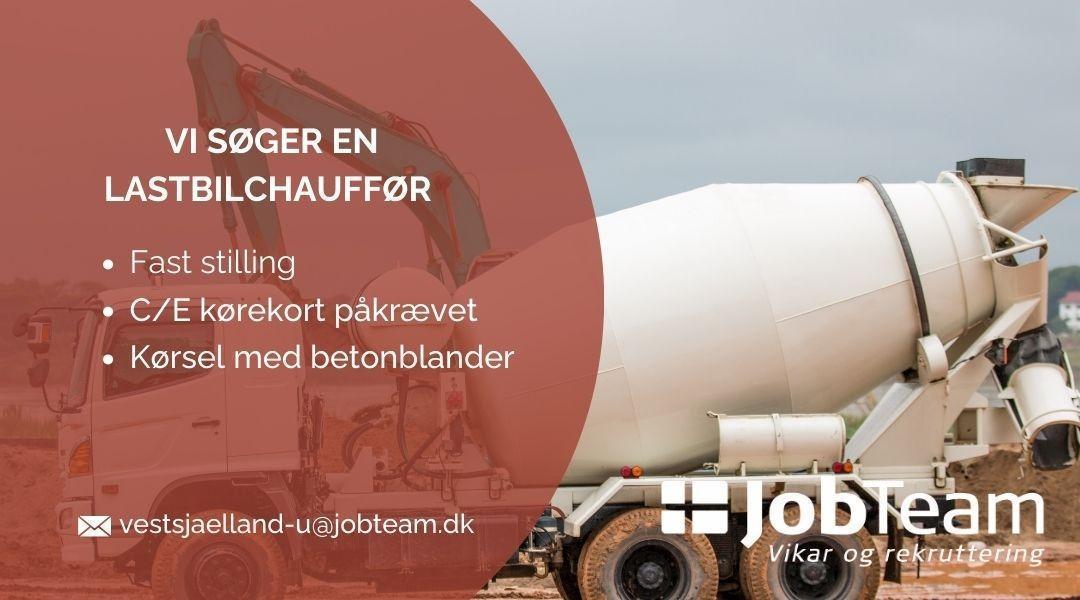 Hvis jobbet lyder som noget for dig, så send din ansøgning med cv på vestsjaelland-u@jobteam.dk. Mærk emnefeltet med "Betonchauffør, Amager". Du kan også ringe og høre nærmere.