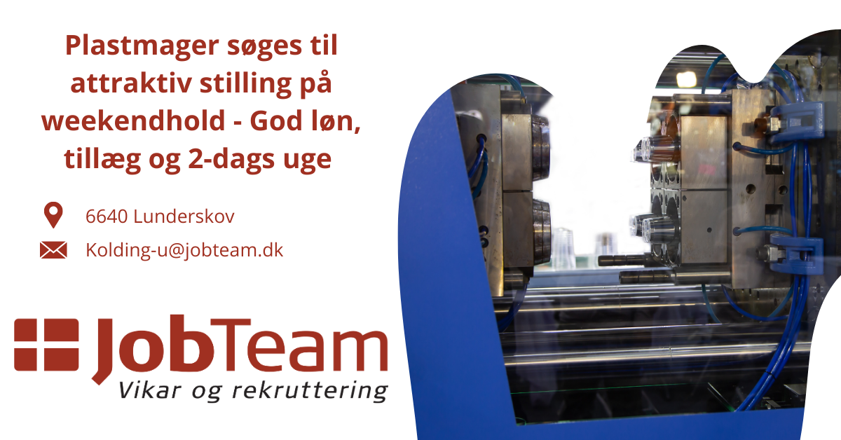 Vi søger en erfaren plastmager til en attraktiv weekendstilling i Lunderskov. Du arbejder lørdag og søndag kl. 06.00–18.00, og får både god løn og weekendtillæg. Stillingen kræver, at du kan arbejde selvstændigt og har høj fokus på kvalitet.