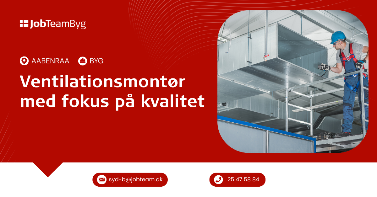 Er du ventilationstekniker i Aabenraa og klar til nye udfordringer? Vores kunde arbejder med installation og vedligeholdelse af ventilationsanlæg. Du vil blive en del af et engageret team med fokus på indeklima og kvalitet.