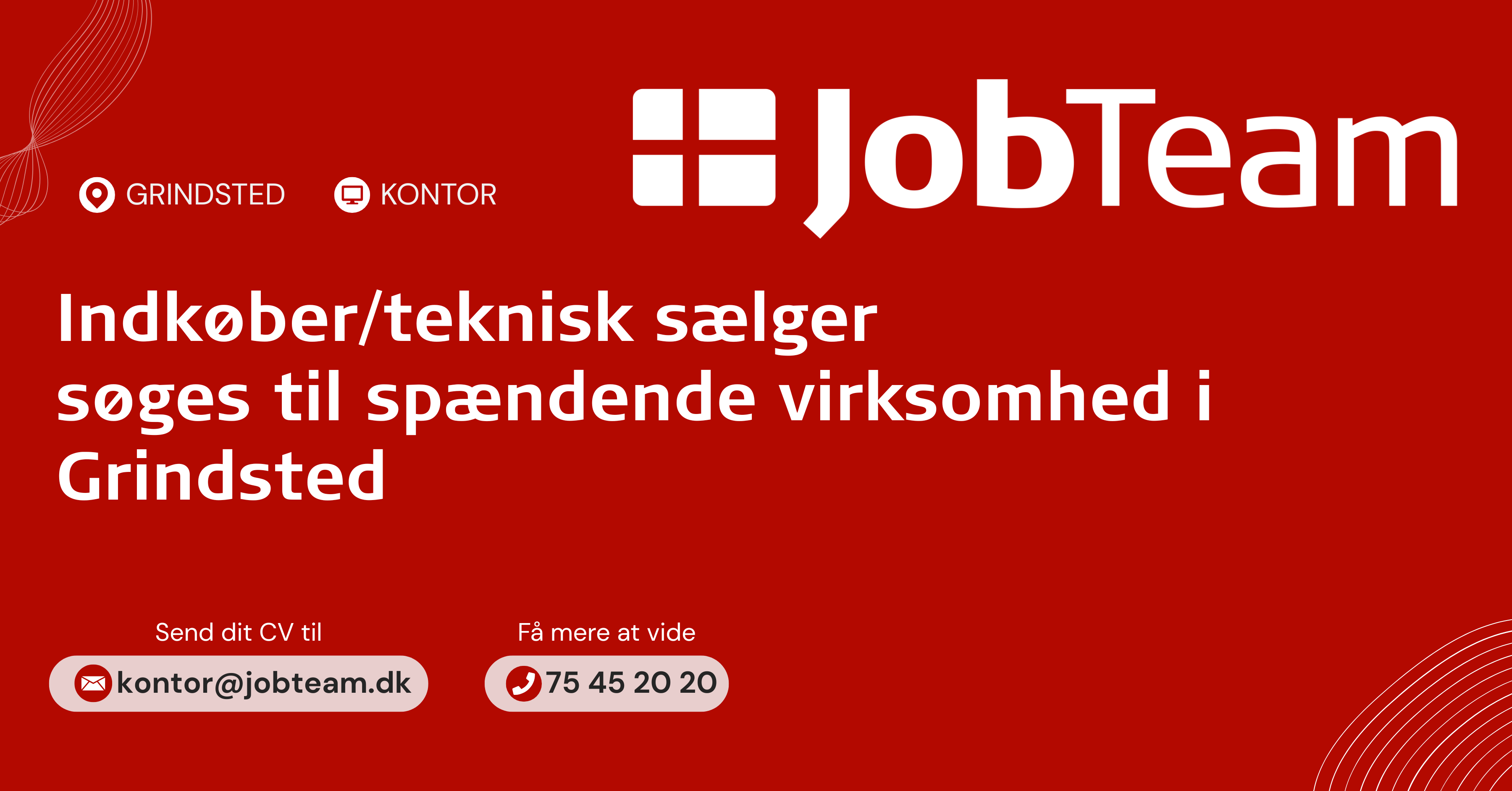 Ved interesse i stillingen bedes du kontakte JobTeams konsulent, Mikkel Skovgaard, gennem mail Kontor@jobteam.dk mærket "LAN-WGI-U45".