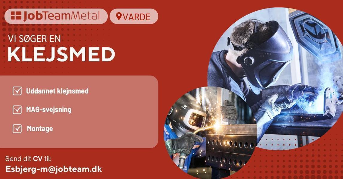 Kontakt os på mail: esbjerg-m@jobteam.dk, mærket "Klejnsmed"
