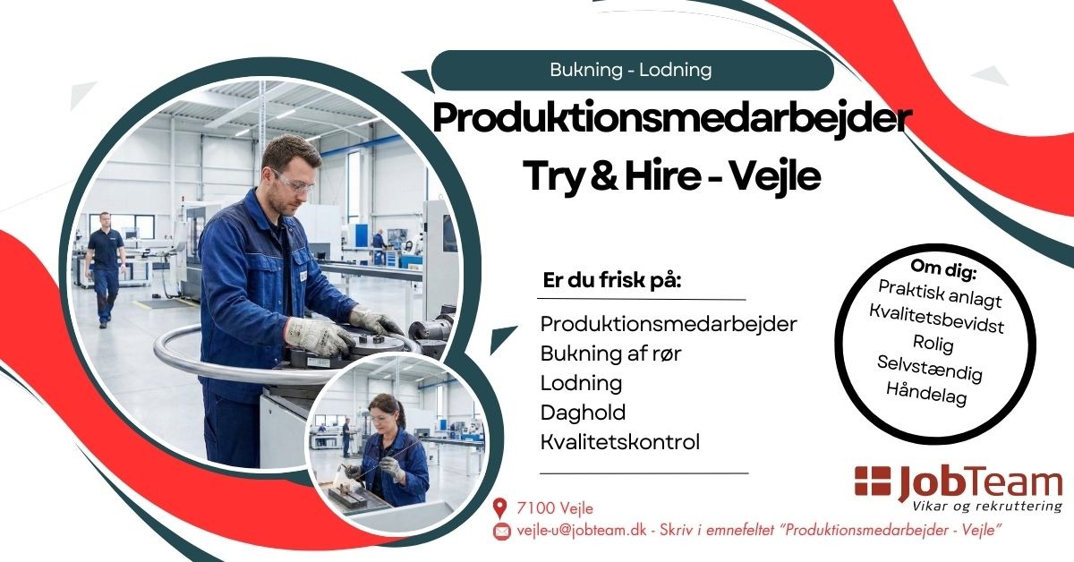 Som vores nye kollega bliver du en del af en succesfuld produktionsvirksomhed, der værdsætter initiativ og den rette mentalitet. Vi tilbyder en grundig oplæring, så selvom du ikke er ekspert i dag, kan du blive det hos os. Stillingen starter som et Try & Hire-forløb, hvor målet er fastansættelse for den rette medarbejder.