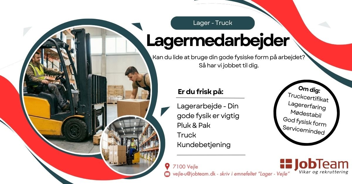 Er du klar til at gribe denne chance? Send din ansøgning og CV hurtigst muligt til vejle-u@jobteam.dk. Da stillingen ønskes besat hurtigst muligt vil der løbende blive holdt samtaler. Der ventes dog gerne på den rette kandidat.