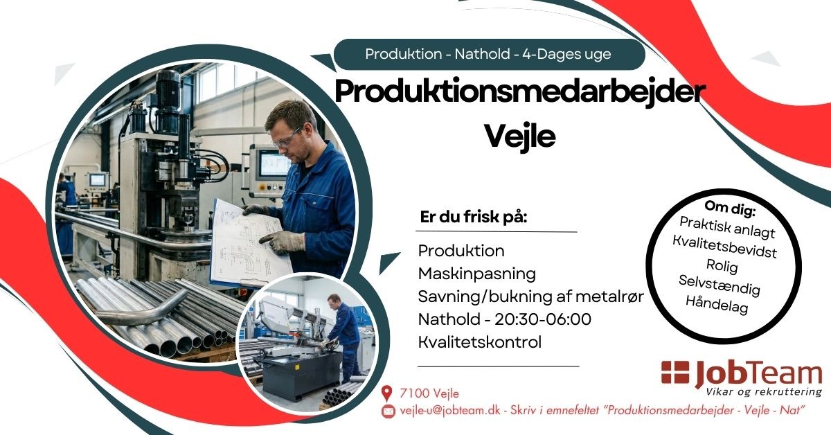Ansøg nu på mail vejle-u@jobteam.dk. Har du spørgsmål kan du ringe på 55667344.