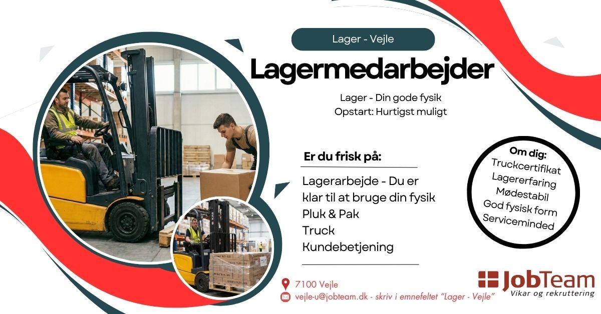 Søg stillingen: Send din ansøgning til vejle-u@jobteam.dk. Spørgsmål? Giv os et kald på 55667344.