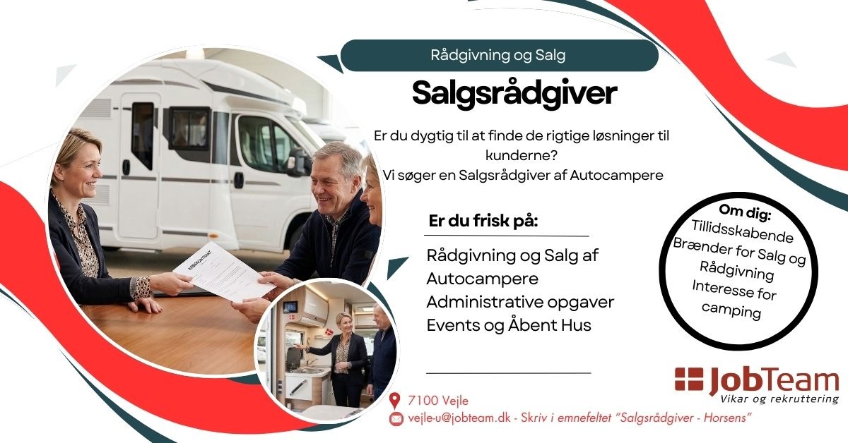 Drømmer du om at gøre din passion for gode kunderelationer til din levevej i en branche, hvor alle er i feriehumør? Vi søger en udadvendt og struktureret kollega, der vil være med til at realisere vores kunders rejseplaner. Her vægter vi din personlige drivkraft og din evne til at skabe tillid højere end et langt CV. Vi søger en Salgsrådgiver til vores Team med salg af autocampere.