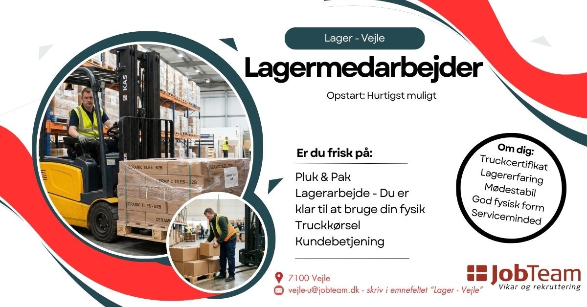 Søg stillingen: Send din ansøgning til vejle-u@jobteam.dk. Spørgsmål? Giv os et kald på 55667344.