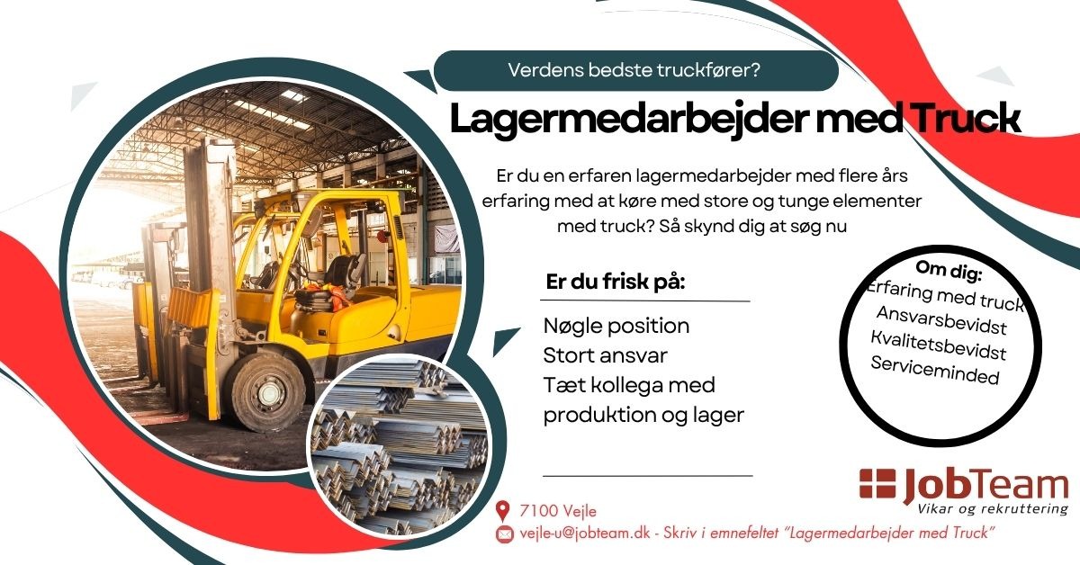 Vil du være en nøglespiller på vores lager, hvor du får ansvar for håndtering af store og tunge emner? Vi søger en struktureret og erfaren truckfører, der kan indgå i et tæt samarbejde med produktionen. Søg stillingen nu via mail vejle-u@jobteam.dk