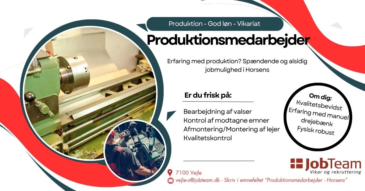 Lyder dette som noget for dig? Så send os dit CV allerede i dag på mail vejle-u@jobteam.dk. Vi holder samtaler løbende og ansætter, så snart vi har fundet de rette kandidater.