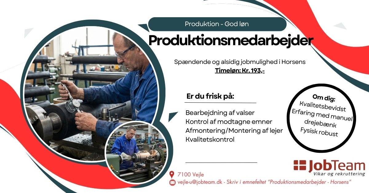 Lyder dette som noget for dig? Så send os dit CV allerede i dag på mail vejle-u@jobteam.dk. Vi holder samtaler løbende og ansætter, så snart vi har fundet de rette kandidater.