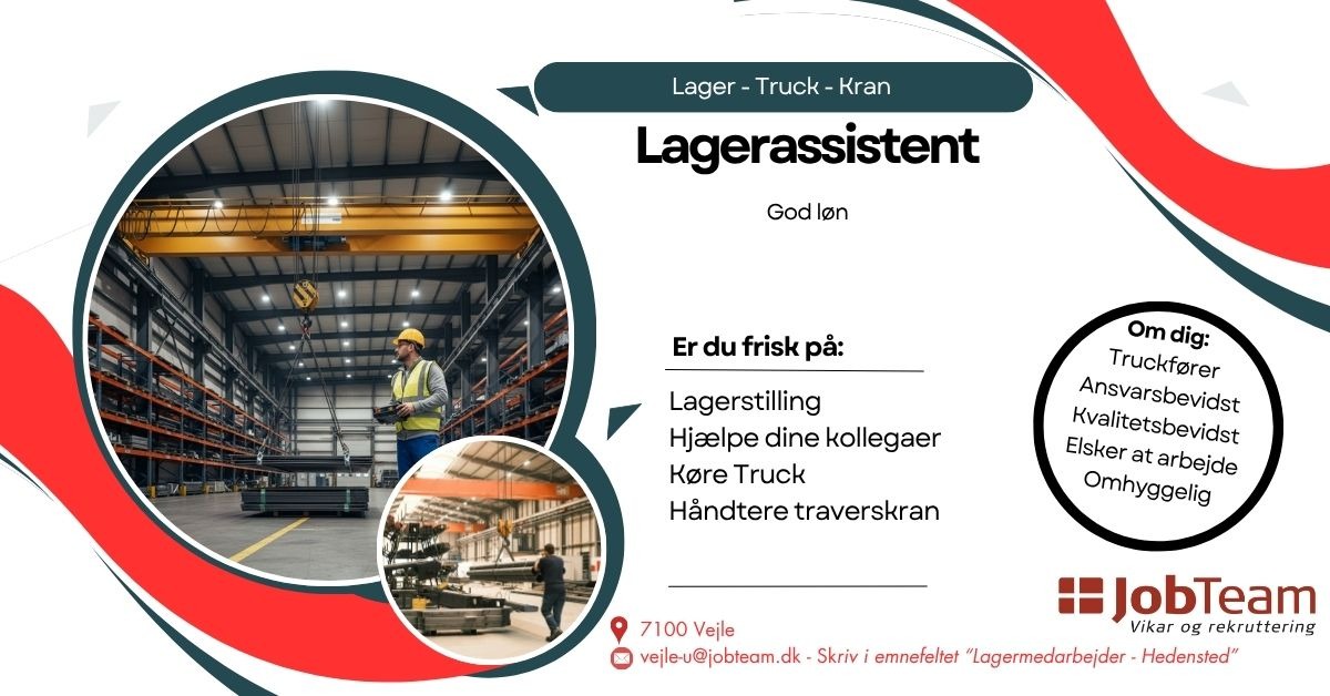 Er du klar til at gribe denne chance? Send din ansøgning og CV hurtigst muligt til vejle-u@jobteam.dk. Da stillingen ønskes besat hurtigst muligt vil der løbende blive holdt samtaler. Der ventes dog gerne på den rette kandidat.