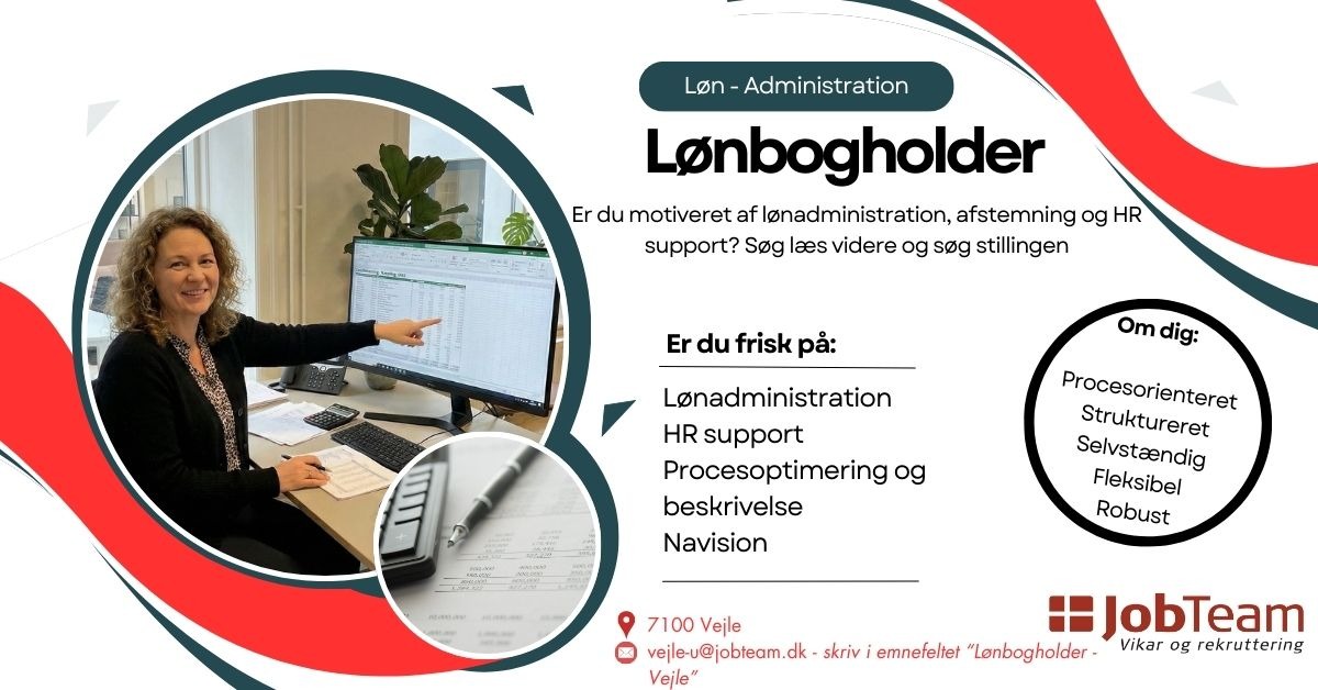 Er du en struktureret og talstærk profil, der trives i krydsfeltet mellem løn, overenskomster og administrative opgaver? Vi søger en selvkørende medarbejder, der ikke blot kan drifte lønnen, men som også har lyst til at rydde op, sætte strøm til processerne og skabe struktur i hverdagen. Ansøg på vejle-u@jobteam.dk - Ved spørgsmål kan du ringe på 55667344.