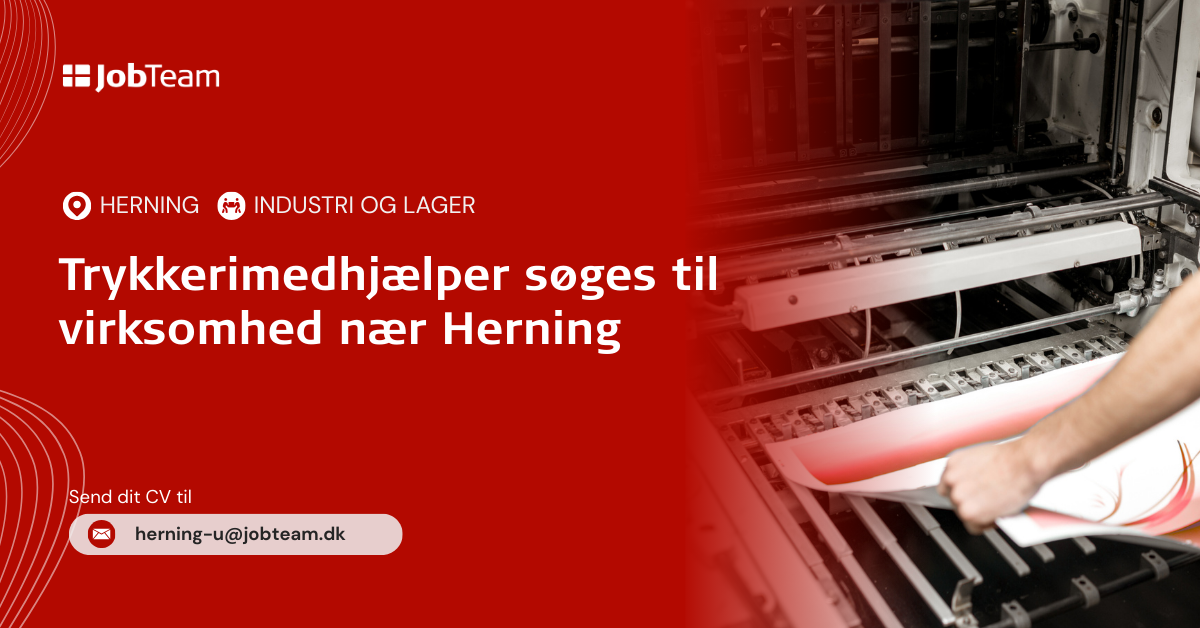 Vi søger en trykkerimedhjælper til nathold nær Herning, hvor du vil blive en del af et mindre team. Du bliver oplært gennem sidemandsoplæring, og der vil altid være en kollega at sparre med. Stillingen kræver overblik og struktur, da du vil have flere opgaver i løbet af din arbejdsdag - men med god planlægning er der tid til at nå det hele!