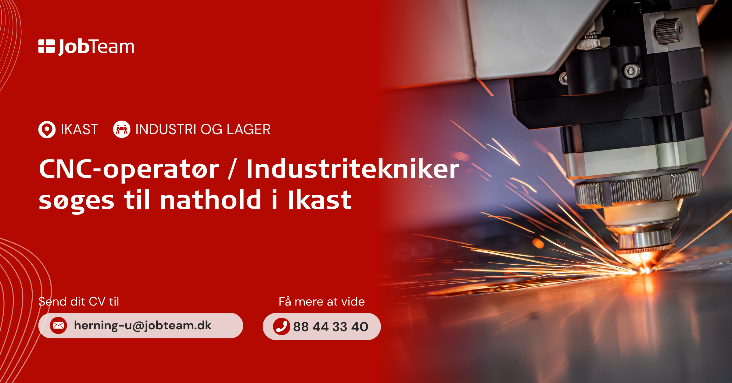 Har du yderligere spørgsmål til jobbet, er du velkommen til at kontakte os på 88 44 33 40 alle hverdage fra kl. 08:00 til 16:00 (Tryk '1')