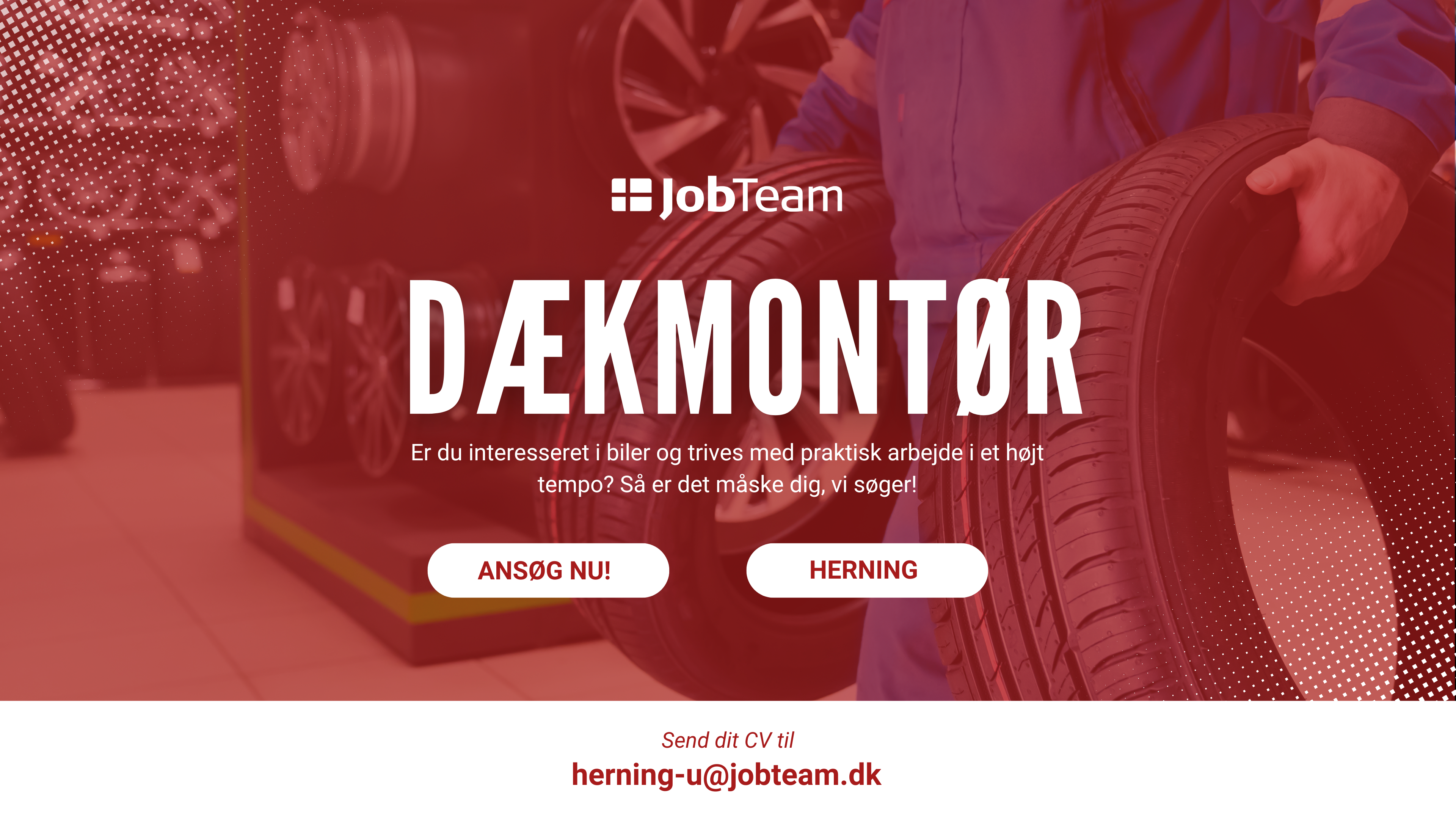 Vi søger en medarbejder til dækskifte i Herning til midlertidig stilling i forbindelse med den kommende dækskifte-sæson. Arbejdsopgaverne omfatter primært dækskifte samt lettere tekniske tjek af biler. Stillingen passer godt til dig med interesse for biler og gerne har erfaring som mekaniker eller lignende.
