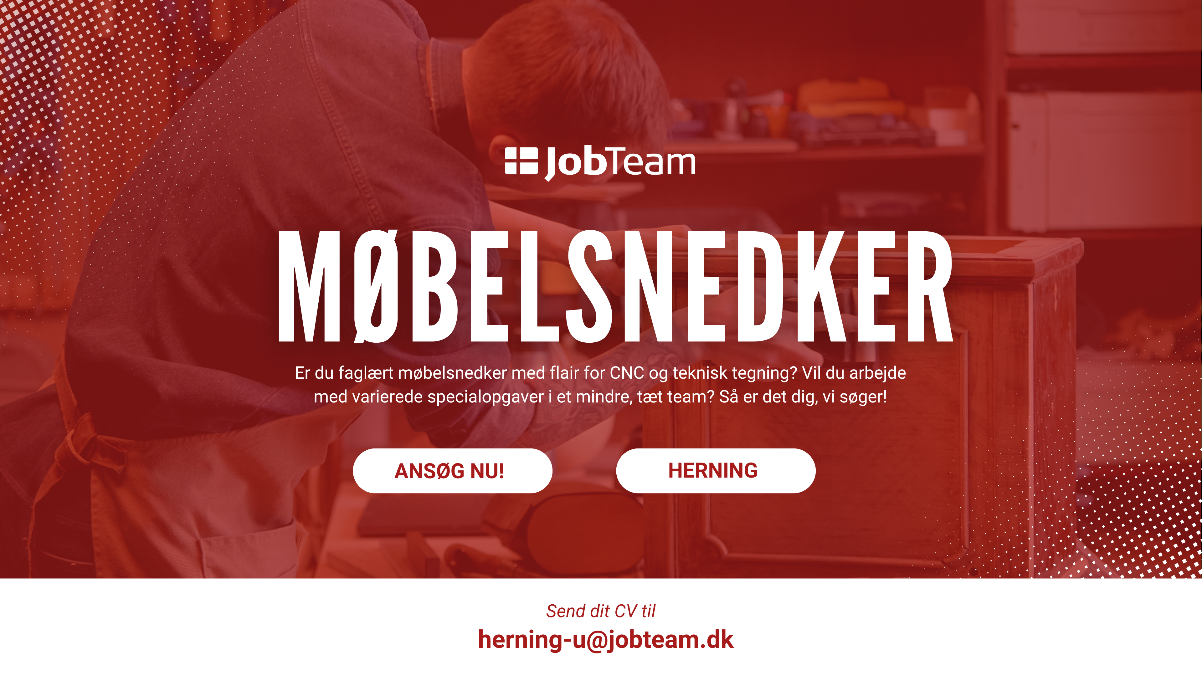 Vi søger en dygtig møbelsnedker til vores produktionsvirksomhed i Herning. Her får du en central rolle i et mindre team, hvor arbejdet omfatter alt fra teknisk tegning til CNC-bearbejdning. Du vil arbejde med produktion af køkkener, hylder, akustikpaneler og andet specialinventar.