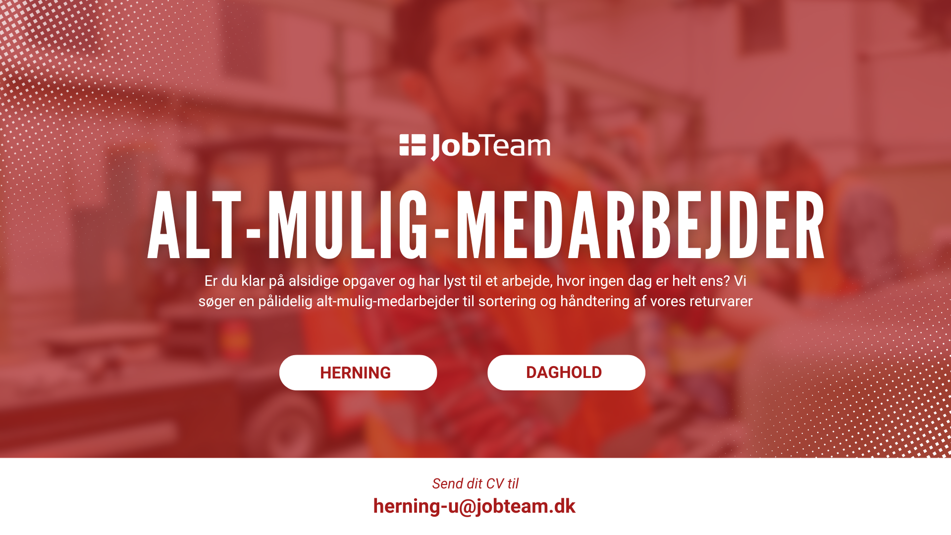 Send os din ansøgning samt CV på mail herning-u@jobteam.dk mrk. "JLM-U49-P11".