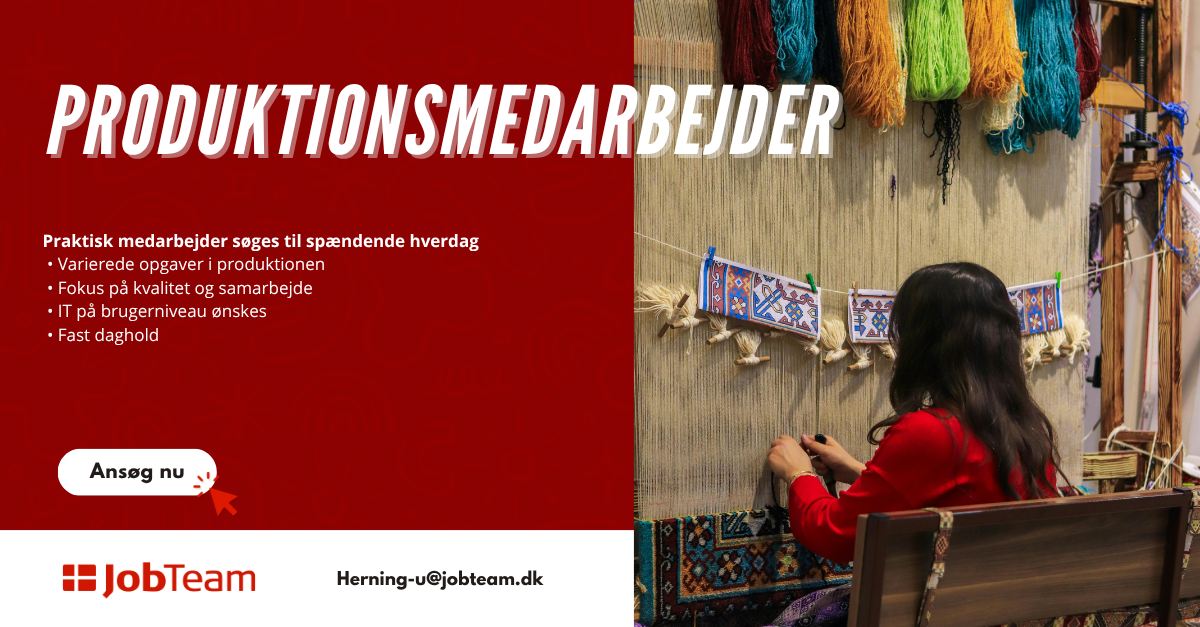 Vi søger en engageret medarbejder til en alsidig rolle, hvor du bliver en vigtig del af produktionen af tæppeprøver og rugs. Her får du mulighed for at arbejde både selvstændigt og i tæt samarbejde med kollegaer.
