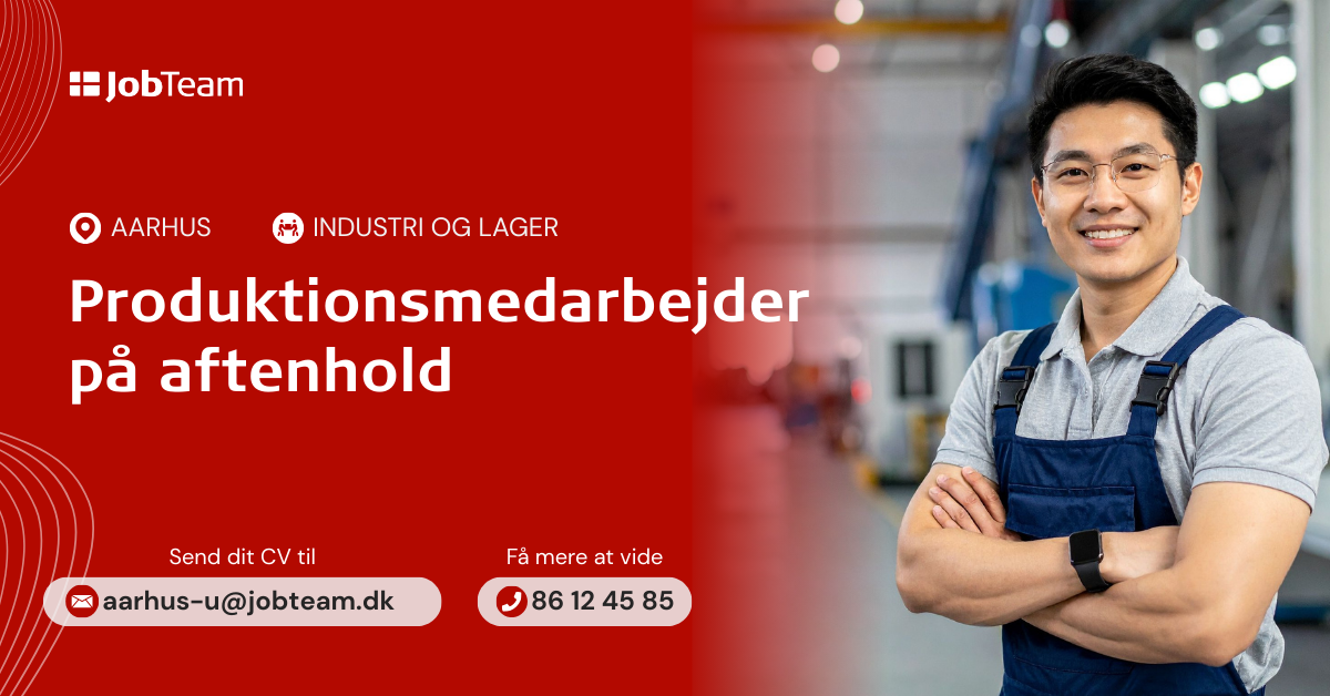 Vi søger en produktionsmedarbejder i Aarhus N til aftenholdsarbejde i fødevareindustrien. Din primære arbejdsopgave vil være maskinbetjening, kvalitetskontrol og sikre en effektiv og problemfri produktionsproces. Aftenholdet består af 4 medarbejdere, hvor du vil komme til at fuldende deres team. Kravet til dig er at du har erfaring med maskinbetjening, produktionsarbejde og aftenholdsarbejde, er dansktalende og en detaljeorienteret medarbejder.