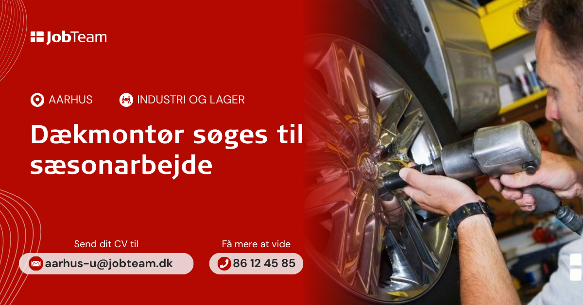 Vi søger en dækmontør til sæsonarbejde i Aarhus N. Stillingen er henover dækskiftesæsonen og du vil skulle montere og afbalancere dæk, stå med kundeservice og evt hjælpe med lidt lettere mekanisk arbejde. Arbejdstiderne er fra 07:30-16:00 og fredag til 15:30. Stillingen kræver at du har erfaring med dækmontage, har hænderne skruet rigtig på samt er arbejdsom og mødestabil.
