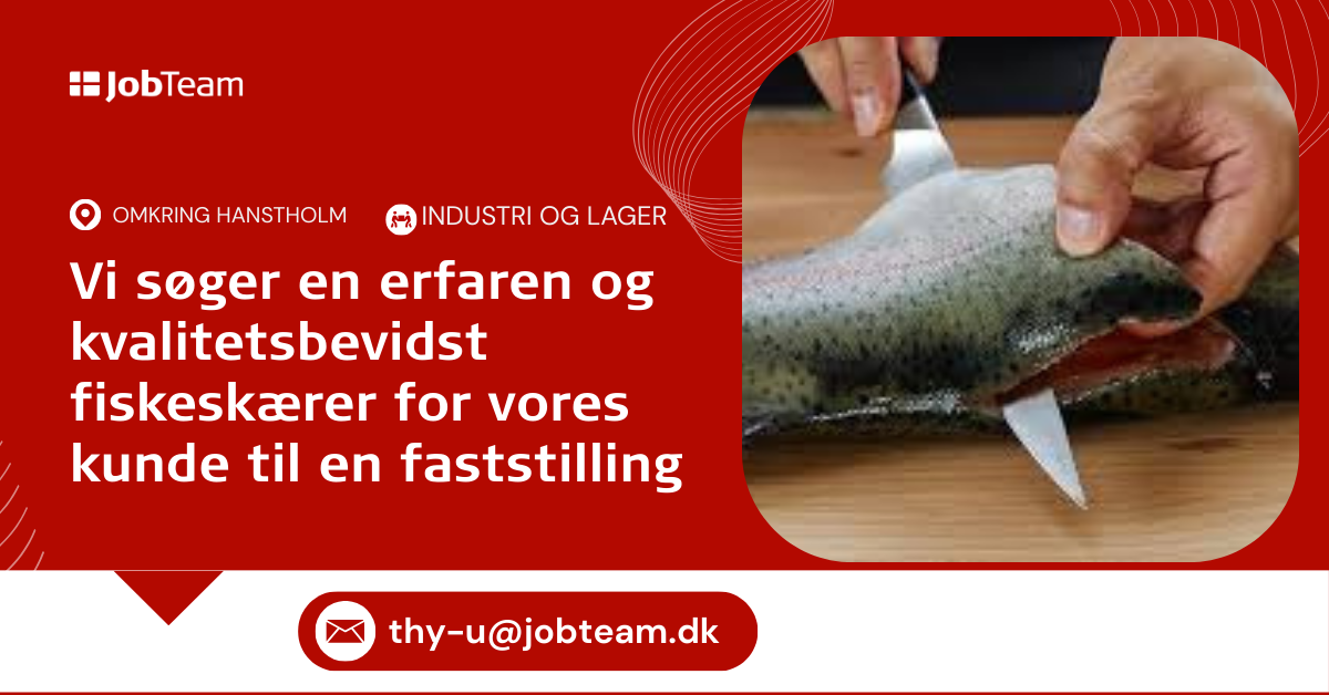 Vi søger en frisk og engageret fiskeskærer til daghold nær Hanstholm. Arbejdsopgaverne kan være af varierende form, men det bliver primært præcis skæring og filetering af flad- og rundfisk, og at sikre at produktionsprocesserne og driften kører effektivt og fejlfrit. Der er tale om en fast stilling