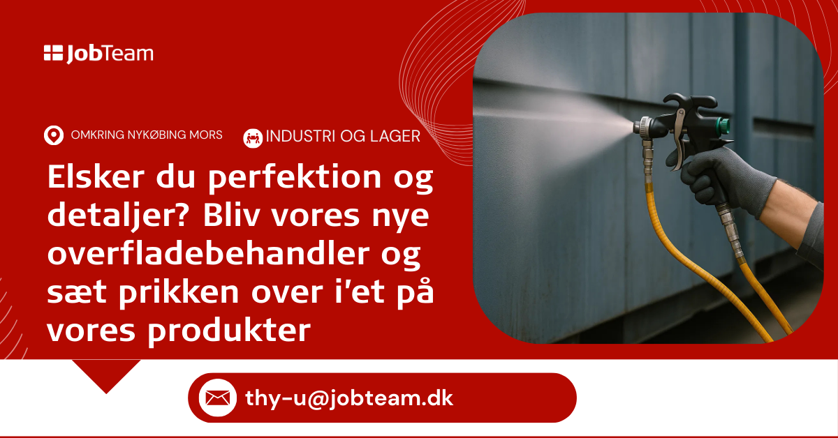 Vi søger en dygtig og kvalitetsbevidst overfladebehandler/industrilakerer til vores produktion nær Nykøbing Mors. Du bliver en del af et moderne team, hvor der arbejdes med professionelle processer, godt udstyr og fokus på kvalitet i alle led.  Hvis dette lyder som noget for dig, så tøv ikke med at sende en ansøgning til thy-u@jobteam.dk