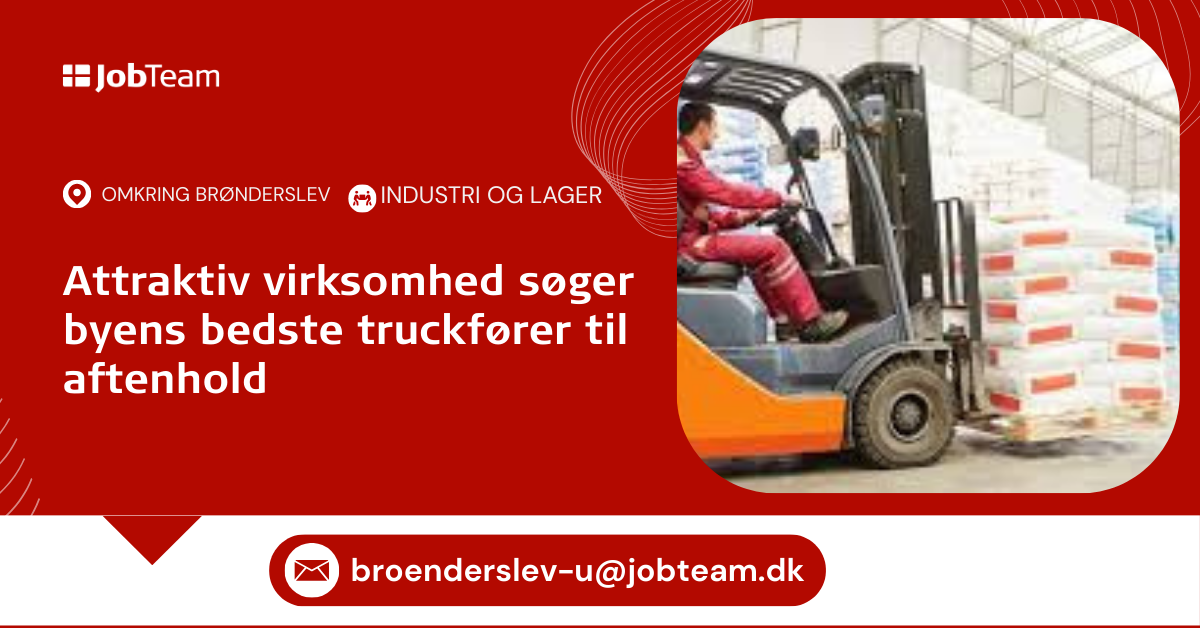 Hvis du har erfaring som truckfører og er klar til at tage udfordringen op, vil vi gerne høre fra dig. Send din ansøgning, CV og gerne en kopi af dit truckcertifikat til broenderslev-u@jobteam.dk.