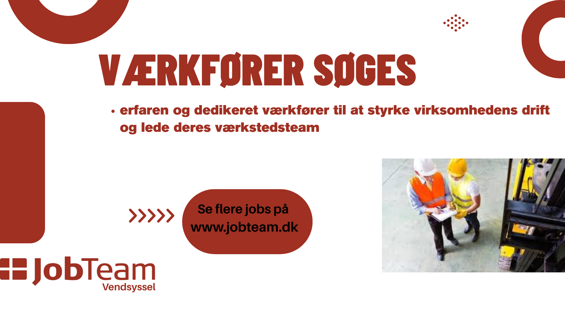 Send din ansøgning, CV og relevante dokumenter via e-mail til broenderslev-u@jobteam.dk. Marker venligst emnefeltet med "Værkfører".