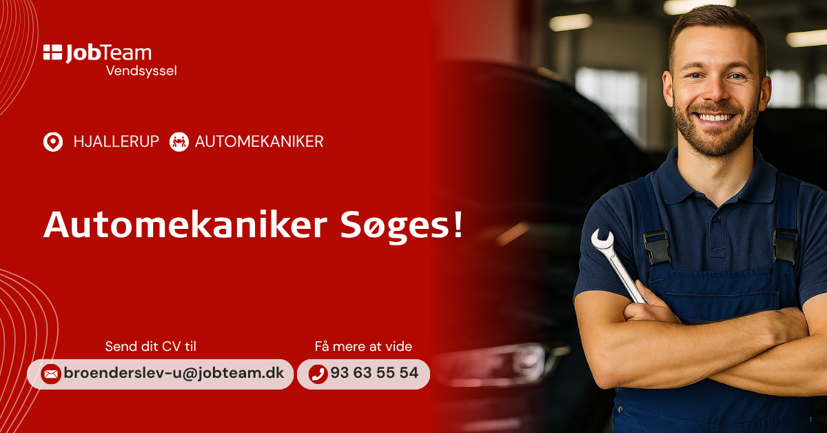 Kontakt os på mail: broenderslev-u@jobteam.dk, mærket med "Mekaniker Hjallerup".