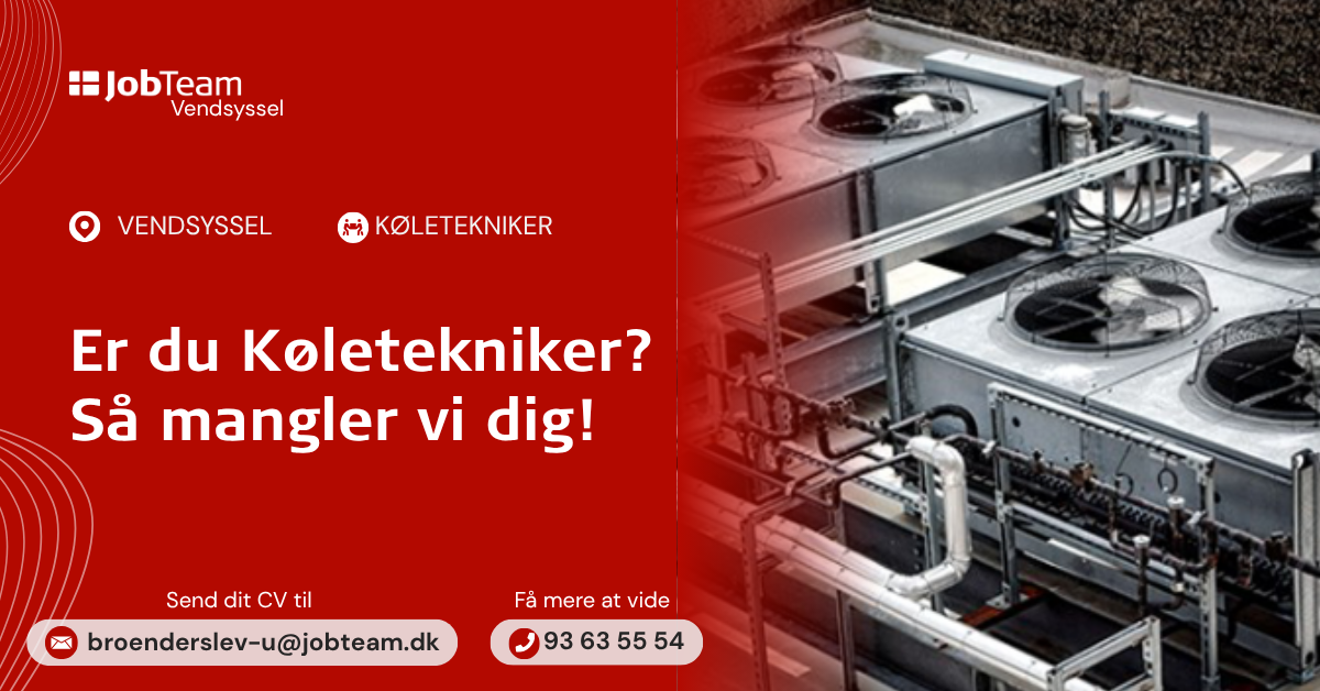 For at komme i betragtning til stillingen kan CV sendes til broenderslev-u@jobteam.dk mrk: "Køletekniker"