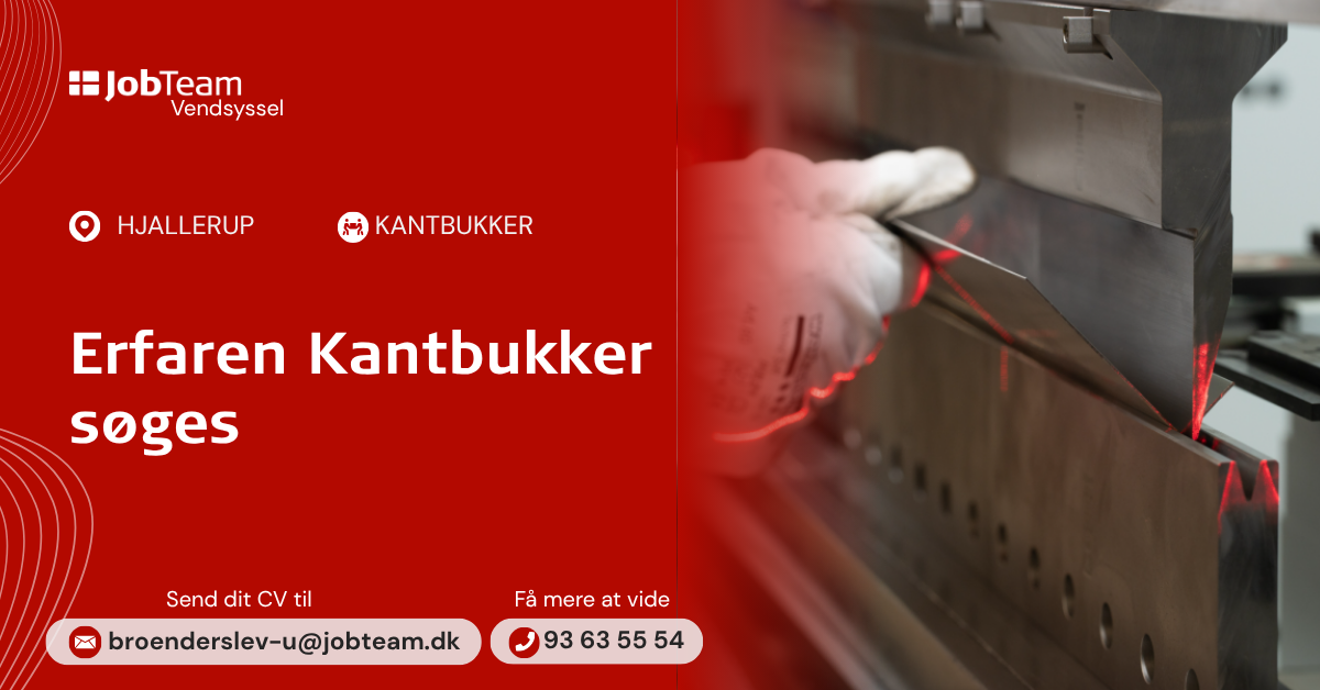 Send os dit CV på mail: broenderslev-u@jobteam.dk mærket "Kantbukker" for at søge jobbet - Eller kontakt os på tlf.: +45 9363 5554