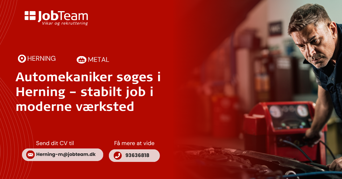 Kontakt os på mail: herning-m@jobteam.dk, mærket med "Mekaniker Herning".