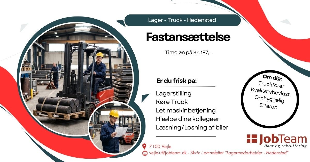 Er du klar til at gribe denne chance? Send din ansøgning og CV hurtigst muligt til vejle-u@jobteam.dk. Da stillingen ønskes besat hurtigst muligt vil der løbende blive holdt samtaler. Der ventes dog på den rette kandidat.