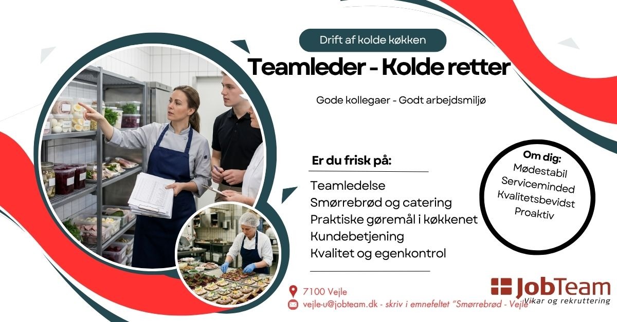 Som vores nye Teamleder får du det overordnede ansvar for den daglige drift og kvalitetssikring i vores kolde køkken. Vi er en moderne forretning med fokus på det gode håndværk og de bedste råvarer. Du bliver en central del af et dedikeret team, hvor vi vægter et sundt arbejdsmiljø og gensidig respekt højt.