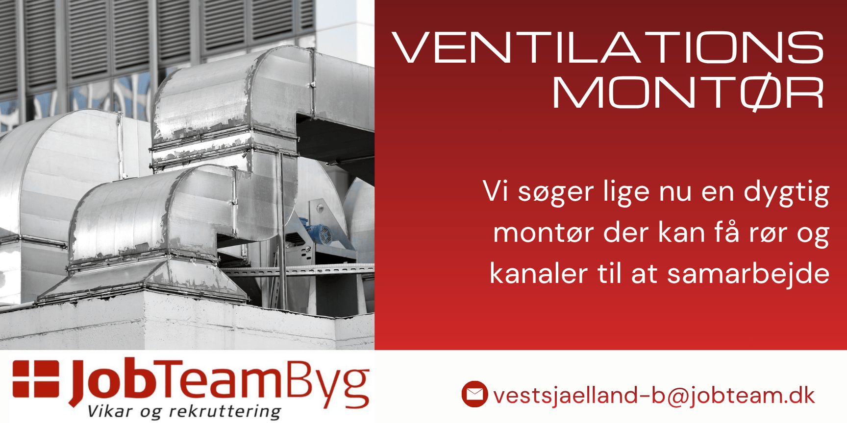 Er du klar til at arbejde som ventilationsmontør i Sorø og gøre en forskel hver dag? Send din ansøgning og CV til vestsjaelland-b@jobteam.dk – vi glæder os til at Læse din ansøgning!