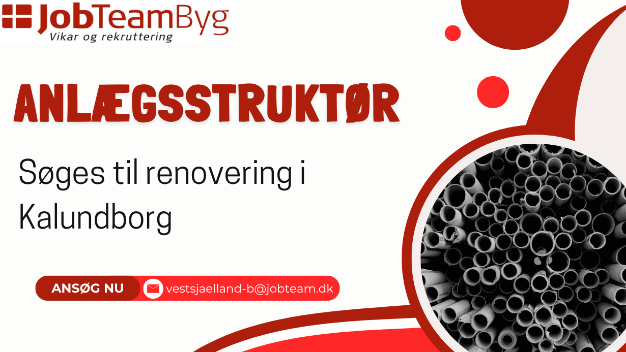 Klar til at arbejde med renovering som anlægsstruktør i Kalundborg? Send din ansøgning og CV til vestsjaelland-b@jobteam.dk– vi glæder os til at høre fra dig!