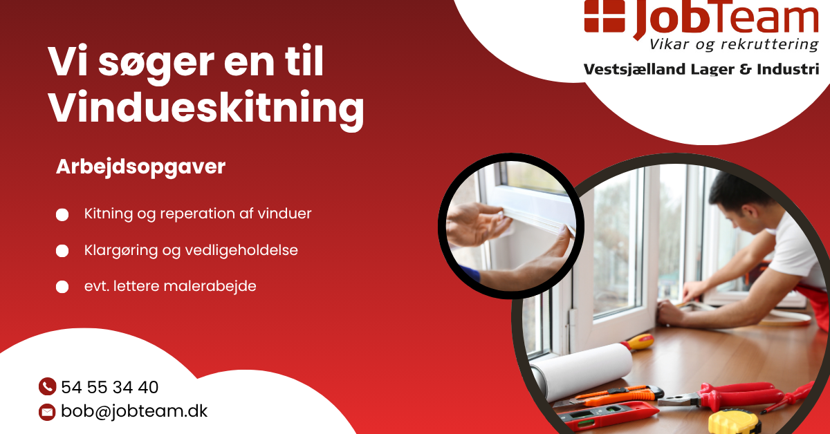 Klar til at arbejde med vindueskitning i Borup? Send dit CV og ansøgning allerede i dag til bob@jobteam.dk eller kontakt Bo på 54553440 for spørgsmål – vi glæder os til at høre fra dig!