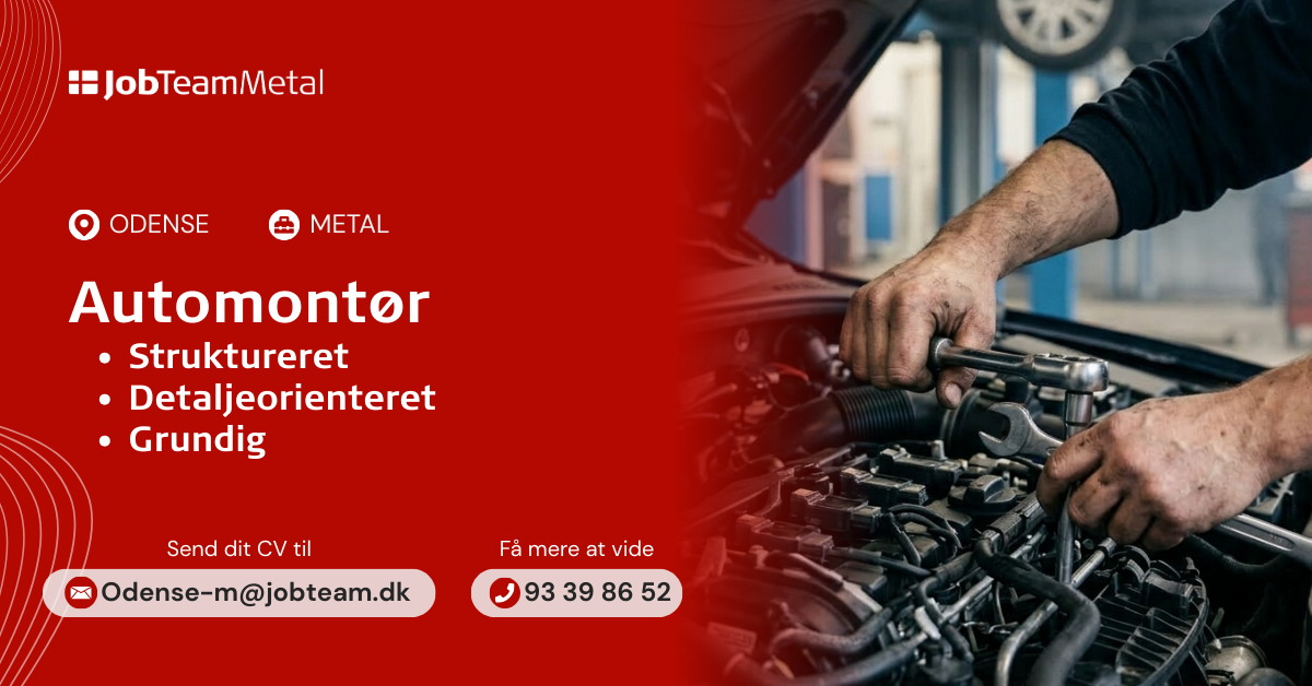 Vores kunde nær Odense søger en passioneret og detalje orienteret automontør. Som en del af teamet vil du være ansvarlig for at montere, vedligeholde, afprøve og samle forskellige elementer. Kravet til dig er derfor at du har erfaring med montage på biler samt har øje for detaljer. Derudover skal du være dansktalende, kvalitetsbevidst og arbejdsom.