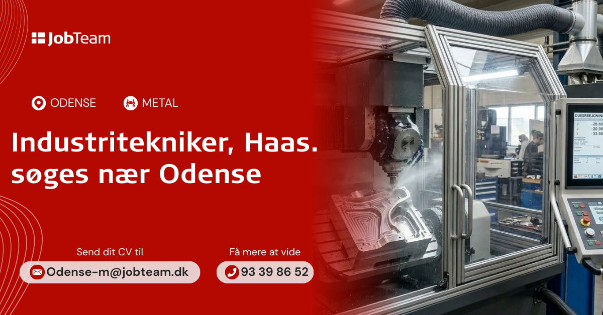 For at komme i betragtning til stillingen sendes CV til Daniel Dyrehauge på odense-m@jobteam.dk mærket "2612-INDU-HAAS-DD". eller ring på 93 39 86 52