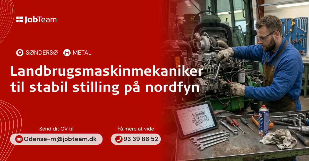 Kontakt os på mail: odense-m@jobteam.dk mærket med "Landbrugsmaskinmekaniker".