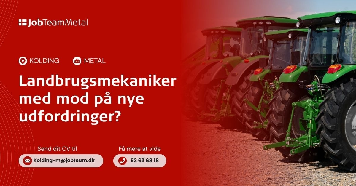 Kontakt os på mail: kolding-m@jobteam.dk, mærket med "Landbrugsmaskinmekaniker".